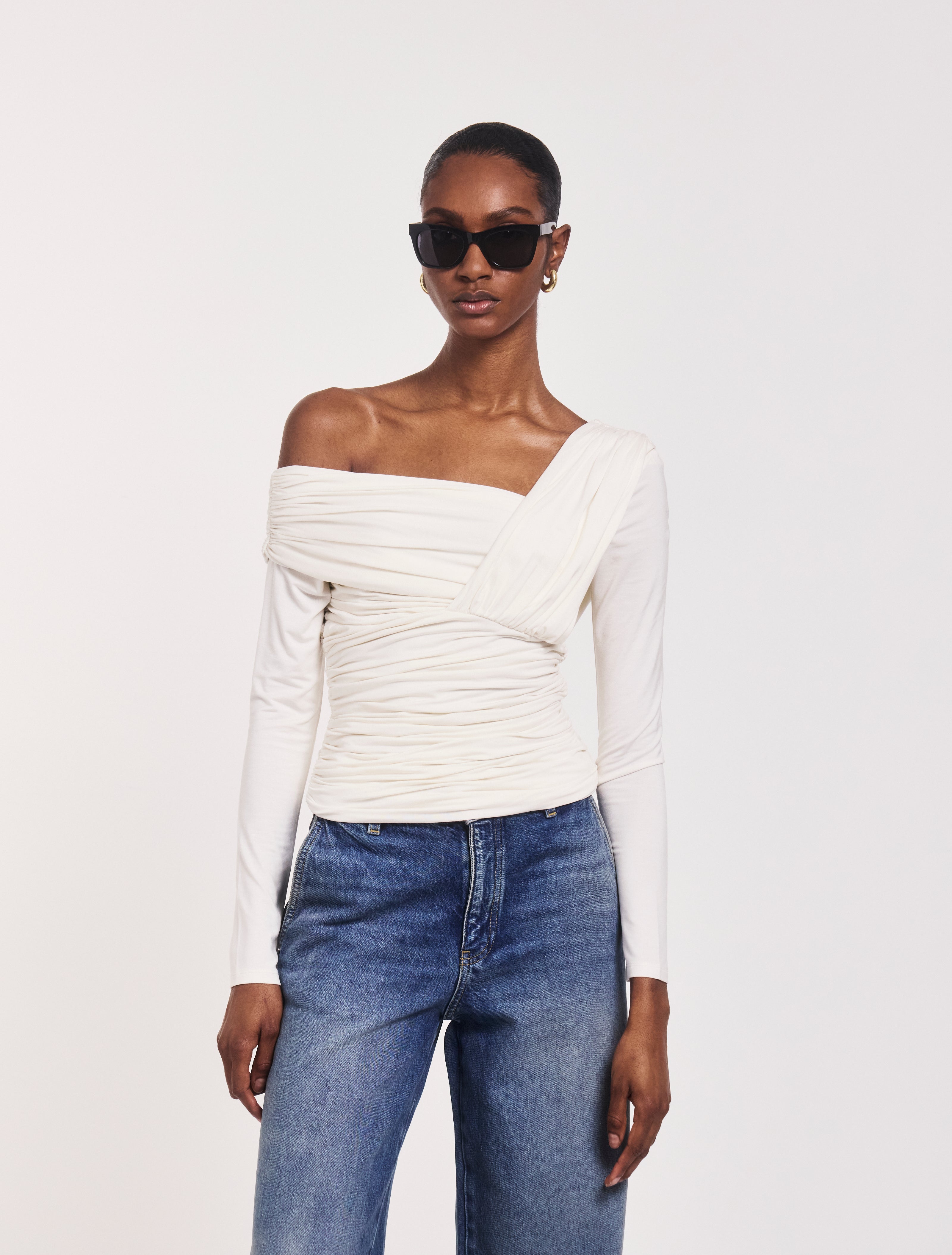 Elegant and sculptural, this off-shoulder top is defined by its softly gathered panels that wrap gracefully around the body. Designed for a second-skin feel with plenty of stretch, it hugs and shapes with ease while maintaining a refined silhouette. The wide crossover neckline can be styled slightly off one shoulder for a contemporary finish, while the ruched sides flatter the waist and create natural drape through the bodice. A subtle twist on everyday sophistication, this top transitions effortlessly from day to night.