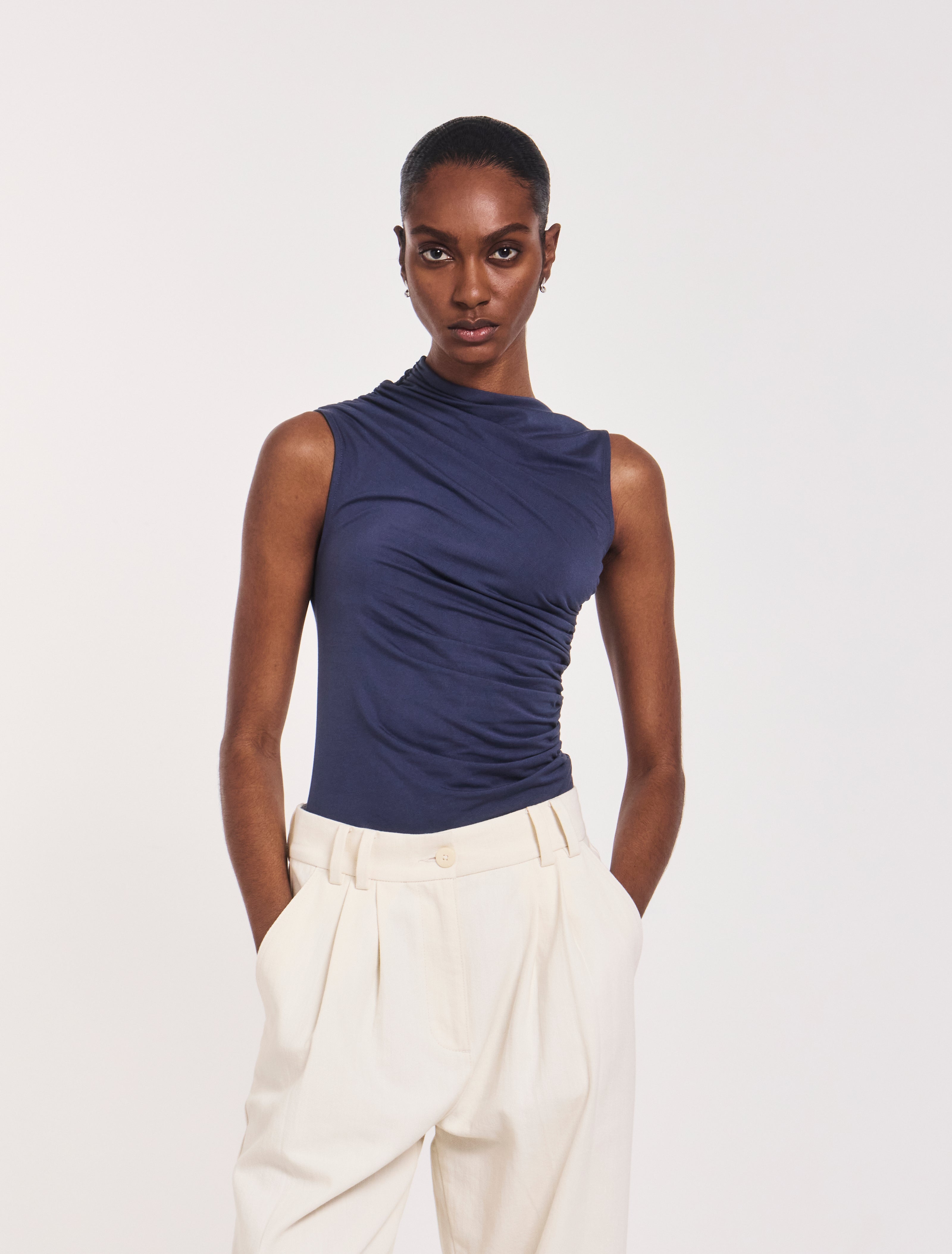 Sleek, sculptural, and effortlessly refined, this sleeveless high-neck top is designed with our signature draping for a flattering, form-fitting silhouette. Crafted from sustainable MicroModal, it offers a soft, breathable feel with a touch of stretch for all-day comfort. Perfect for elevating the everyday, it’s a versatile staple that pairs seamlessly with denim or tailored separates.