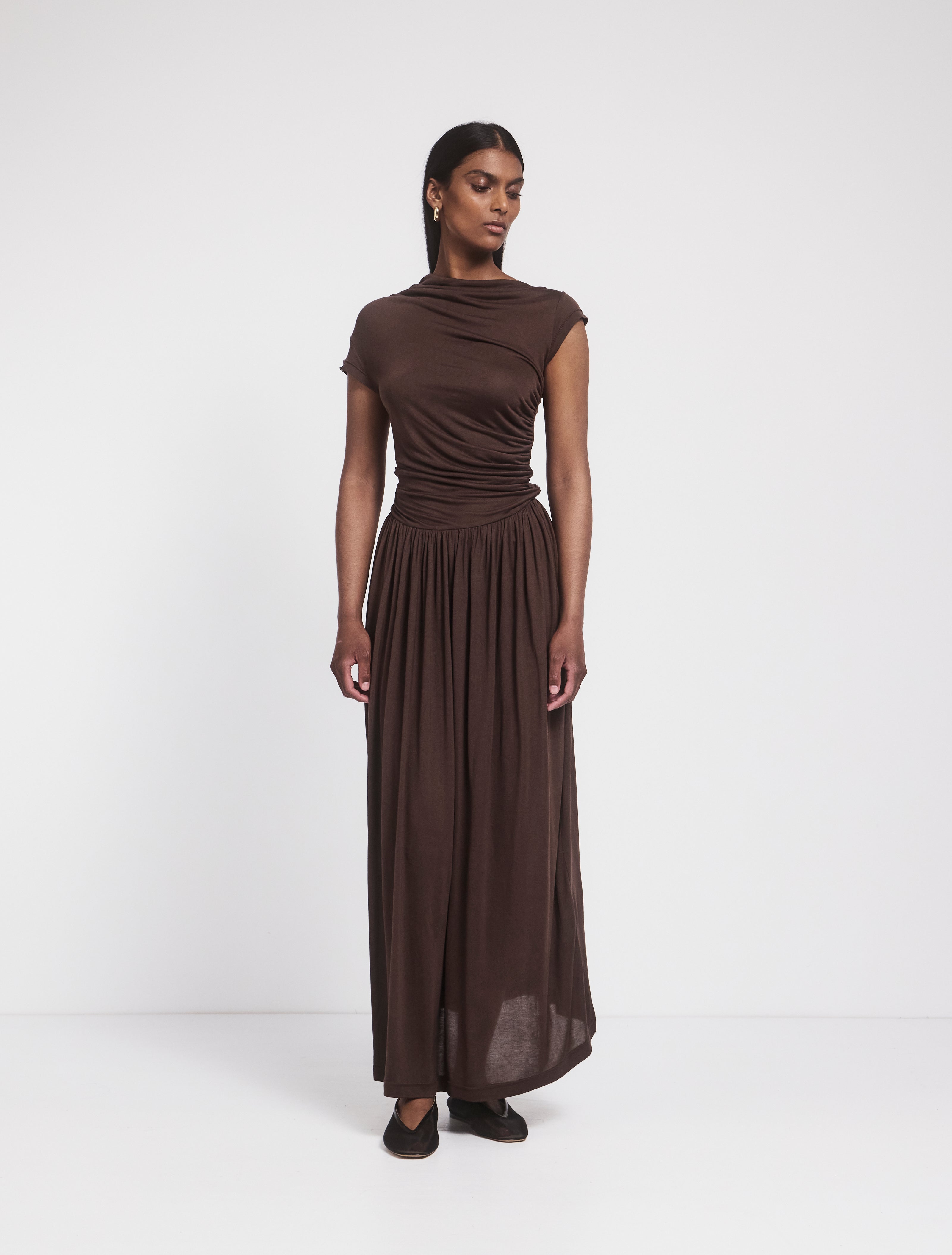 A fluid maxi dress crafted from light and breathable MicroModal with a silky-soft touch. The dress features a boat neck and ruched detailing on the shoulder, side and waist, creating a sumptuous draped effec... Read More