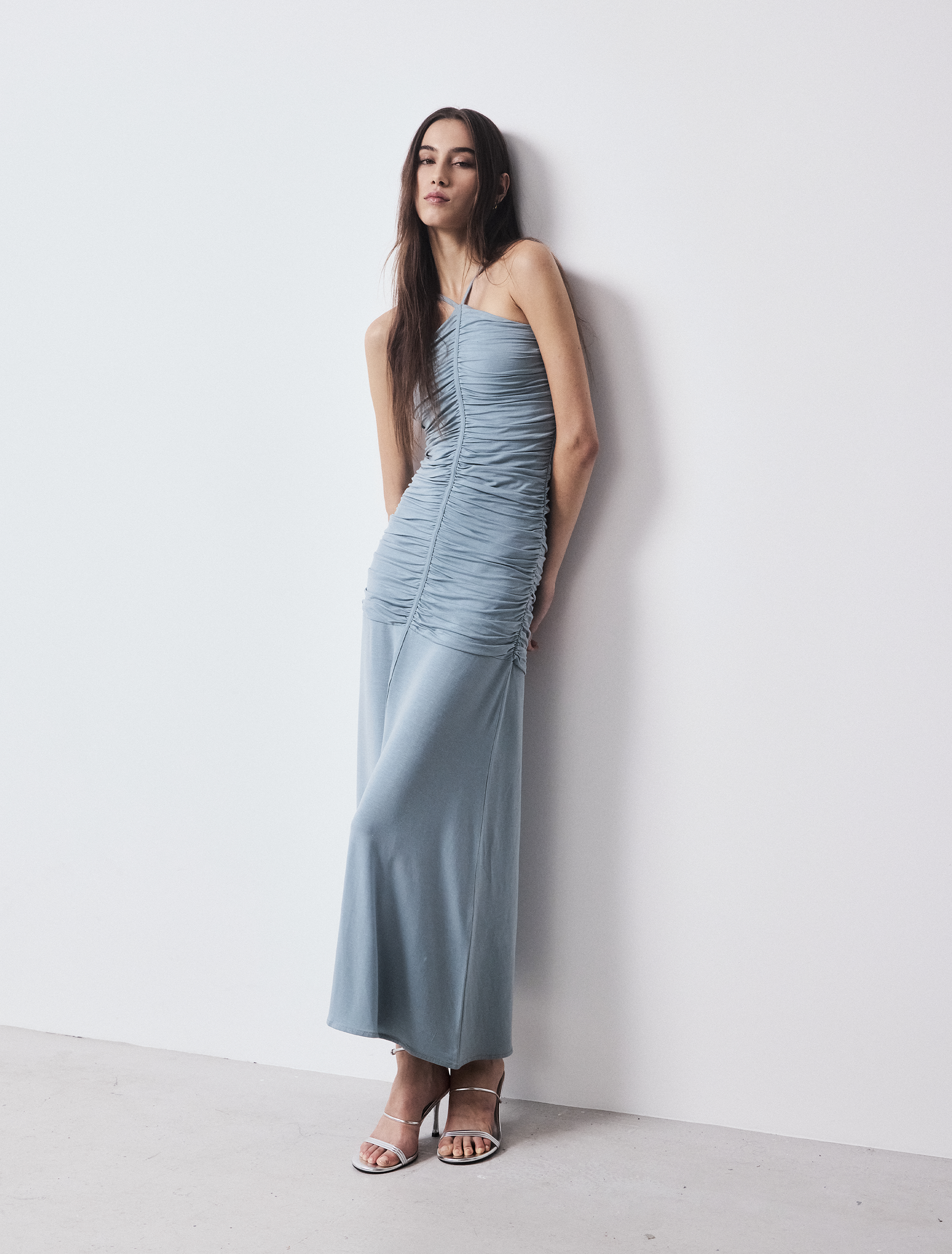 A longline dress with a ruched top and fluid, body-skimming skirt. It's made from TENCEL™ with a touch of stretch and features straps to tie around the neck and an apparent seam detailing running down the front. Wear it on its own in warm climes, or paired with a blazer when the temperature drops.