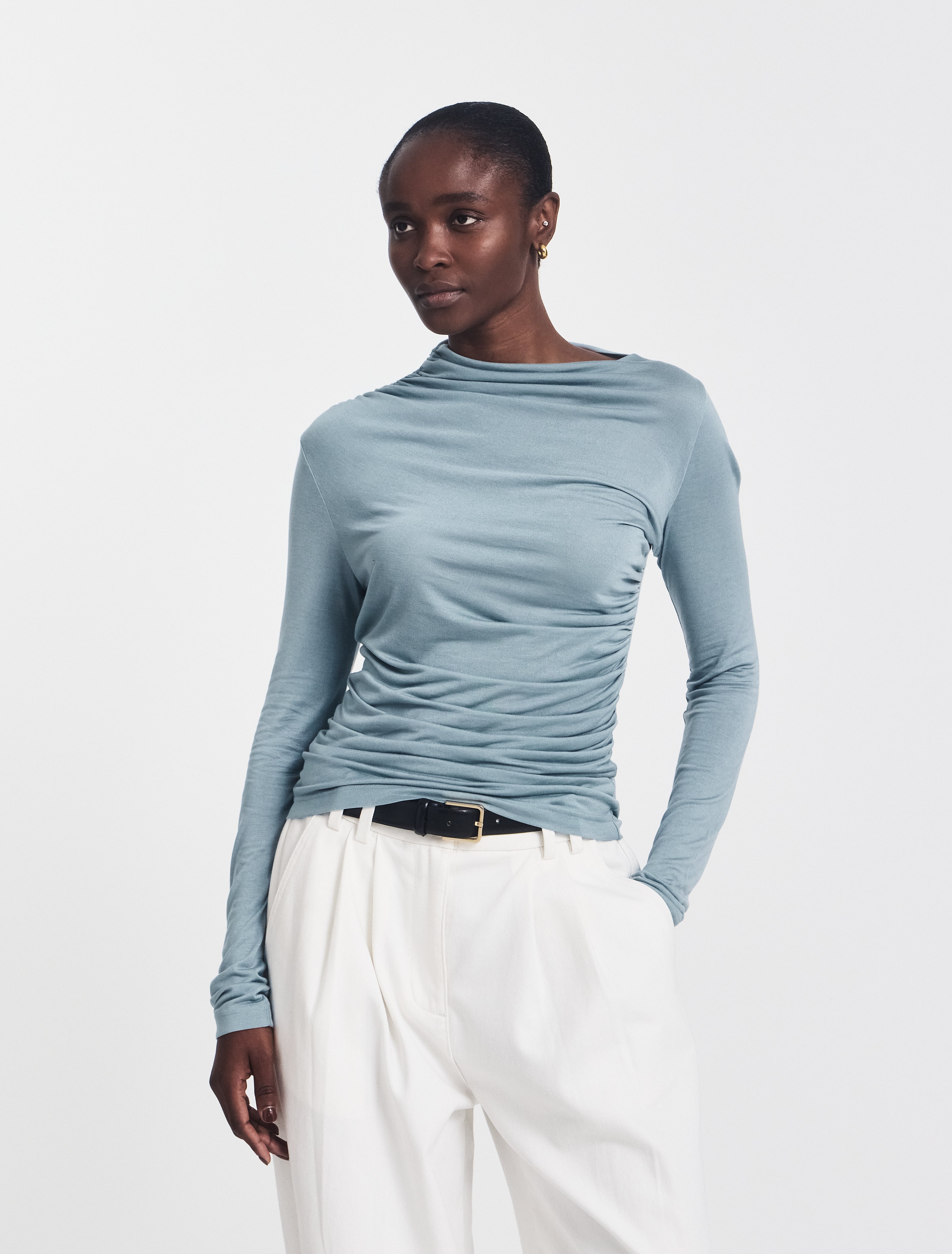 A fine, long sleeve top cut on the hips for a close fit with ruched detailing on the left side and right shoulder. Made from light and breathable MicroModal, the top is silky-soft and gently highlights the silhouette. Wear it with a pair of oversized denim or sleek trousers.