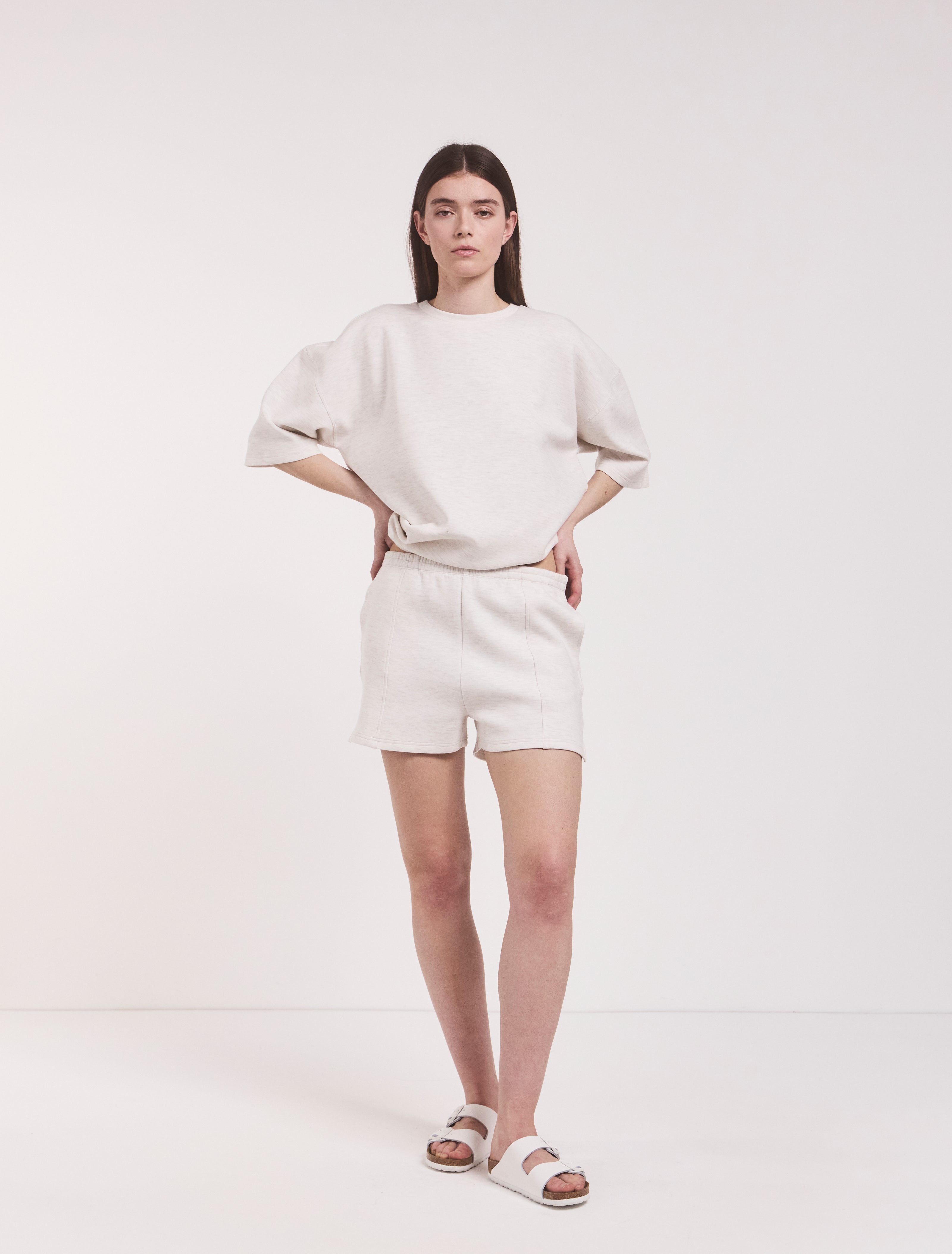 Laid-back comfort, elevated. Crafted from Tencel with a subtle slub texture, these effortless sweat shorts are designed for all-day ease. Featuring a relaxed fit, elasticated waistband, and minimalist seam details, they’re perfect for lounging or layering up. Wear them with the matching sweatshirt for a coordinated off-duty look.