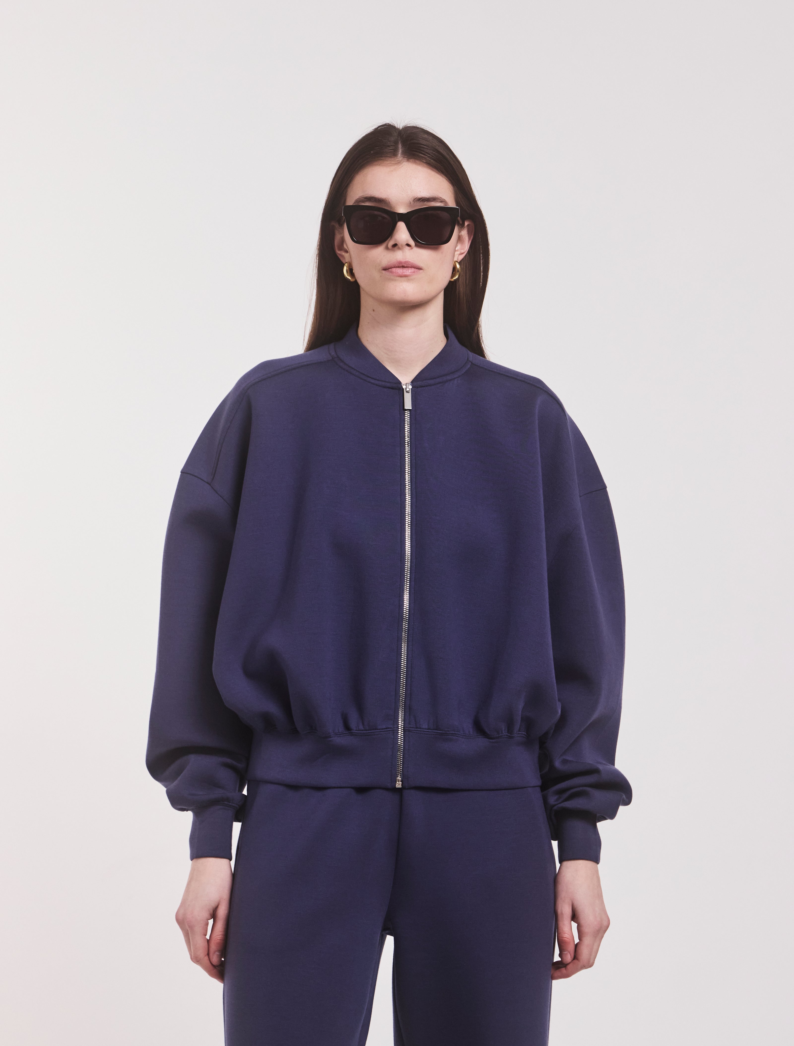 A contemporary layering essential, this lounge bomber jacket is crafted from woven Tencel™ blend with a clean, minimal finish. Its relaxed silhouette is balanced by a neat bomber neckline and slightly exaggerated sleeves. The zip-through front allows for versatile styling — wear it open over casual separates or zipped up for a streamlined look.