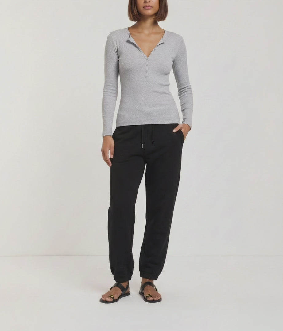 Everyone loves a Henley. Especially a bodycon Henley with 4% added elastane for shape retention. Wear this stretchy ribbed number with everything from jeans to track pants