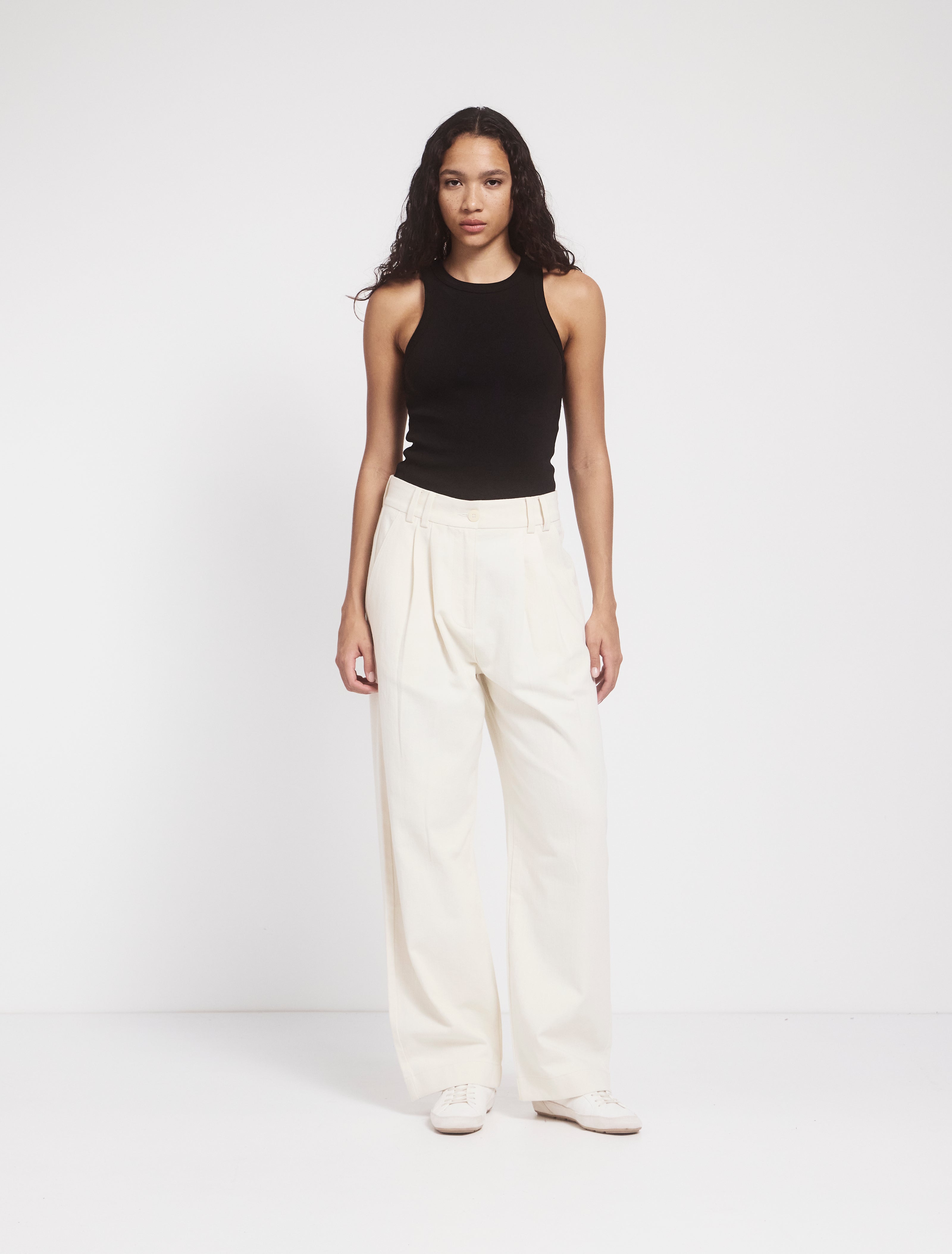 A lightweight pair of trousers crafted from a blend of organic cotton and linen for the warmer months. The trousers are cut with a straight leg for a loose fit with a double pleat, a rear flap pocket and our plant-based Corozo button. Wear it on sunny days with a tucked-in tank top or with a louche shirt.