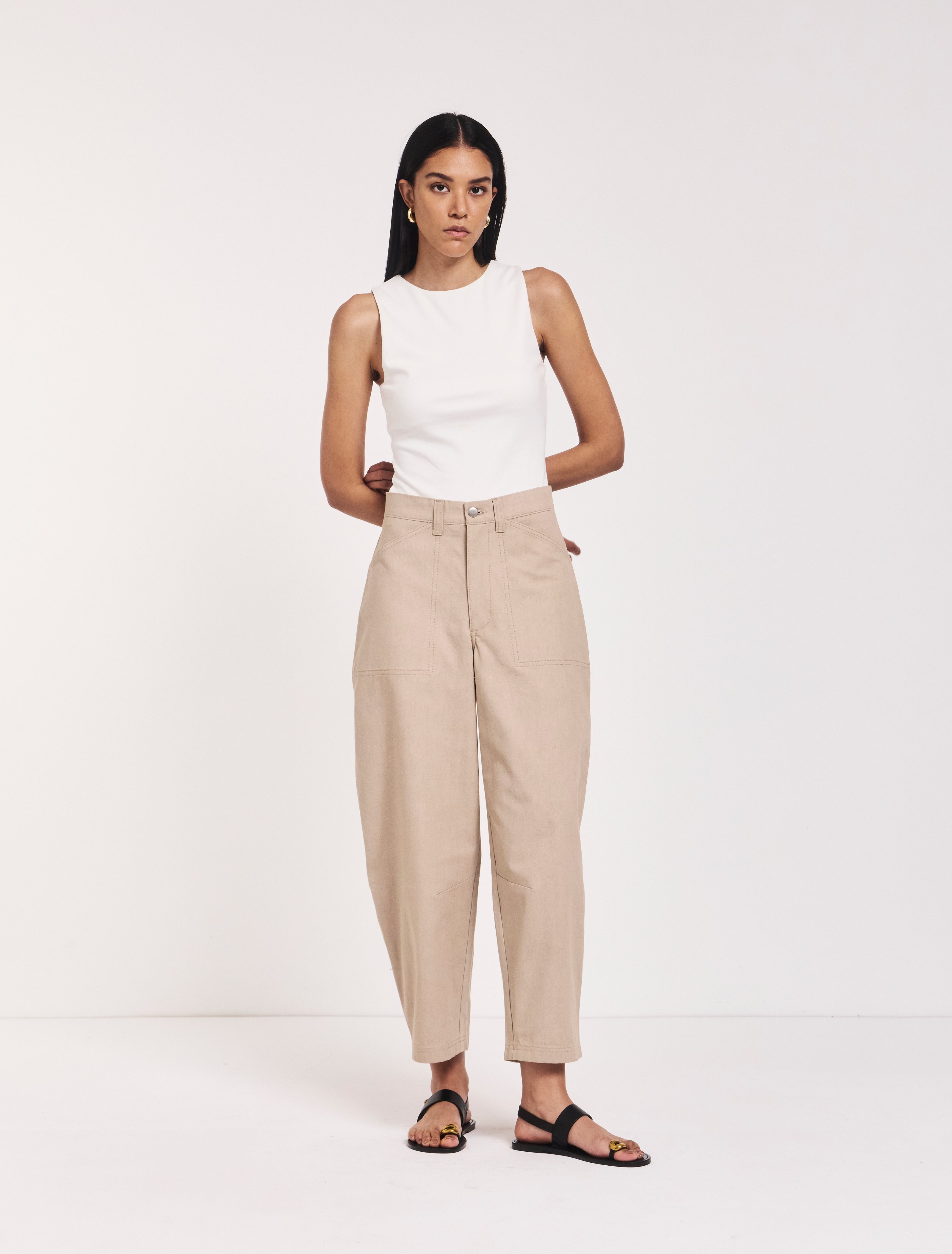 A modern silhouette reimagined with ease. These cropped barrel-leg trousers are cut from a softly structured organic cotton that holds its shape while allowing relaxed movement. Designed with angled patch pockets, darted knees, and a subtle taper, they bring a utilitarian feel to everyday dressing. A flattering high waist and clean finish make them an effortless pairing with tanks, knits, or oversized shirts.