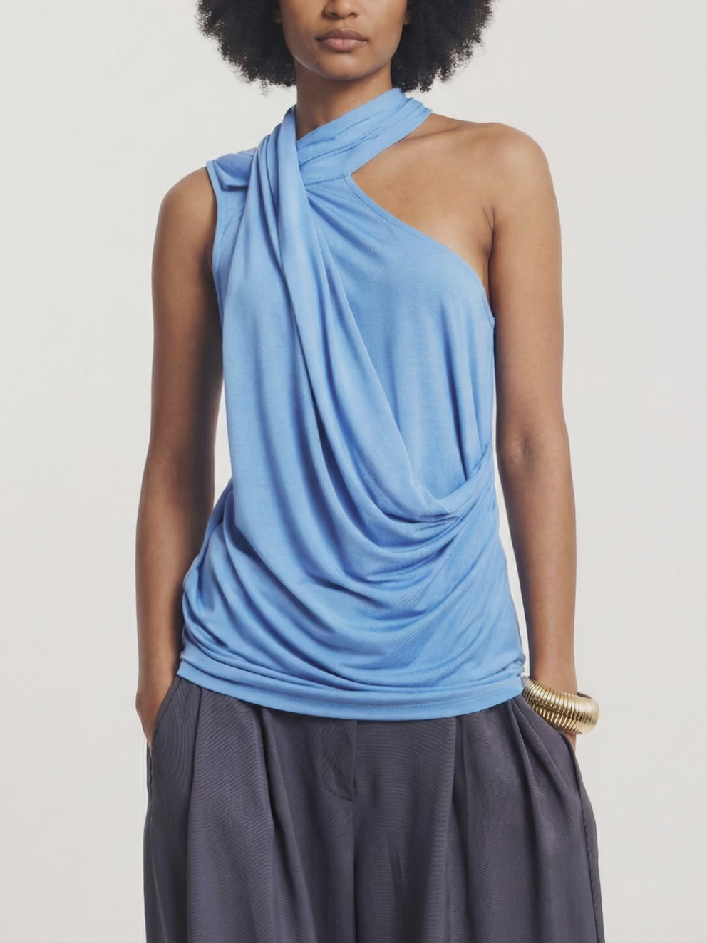 Sophisticated drape for modern poise. The Zora Drape High Neck Top features a high neck with draped fabric for an artistic, enveloping fit that's both cosy and chic. Made from stretch jersey, it's designed for comfort without compromise. Style it with slim pants for balanced proportions. Each purchase you make helps us give back 90% of our profits to our people and causes we believe in.