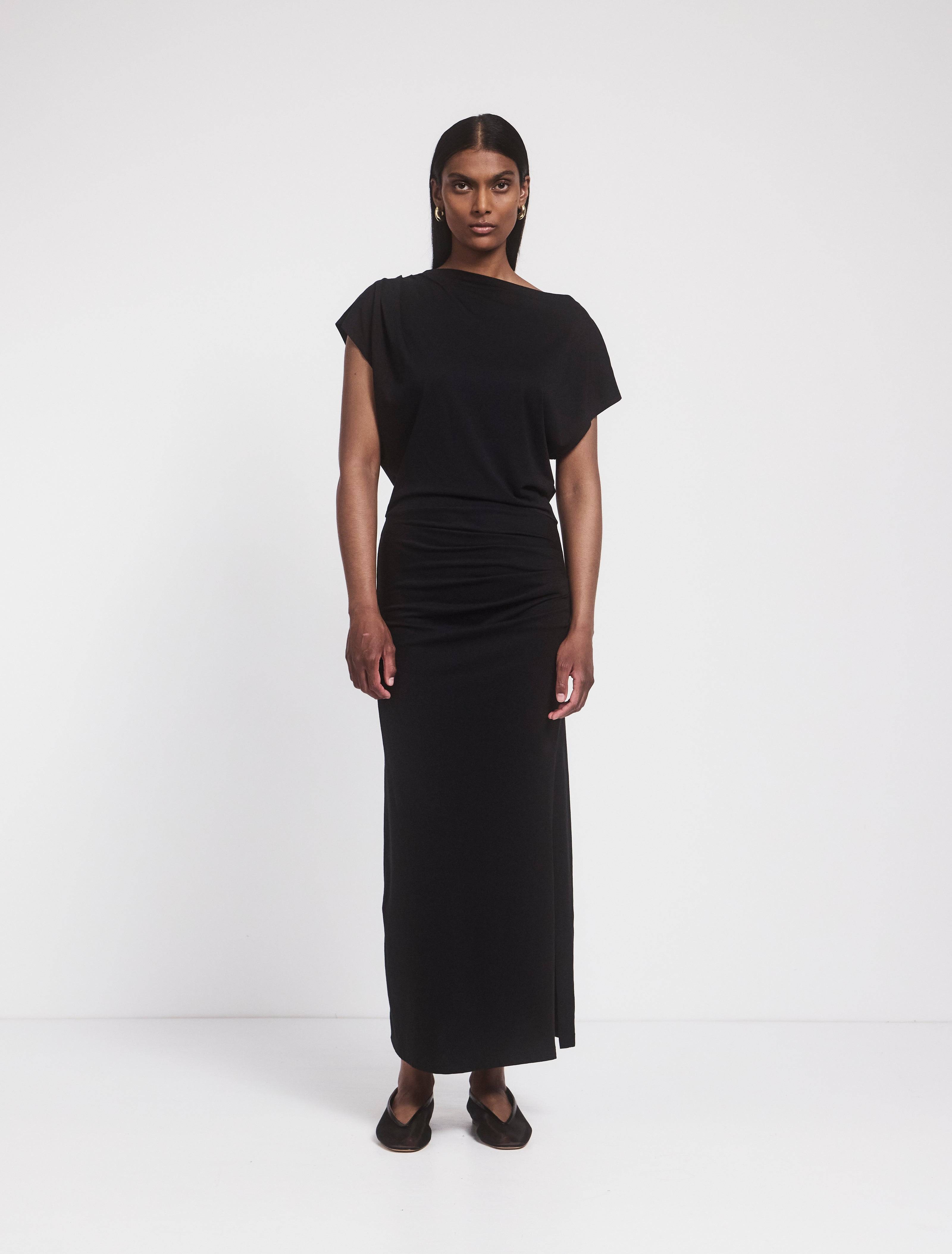 Offered in a comfortable organic cotton and MicroModal jersey fabric, this maxi dress will make a quiet statement at evening events. It is designed with a relaxed T-shirt shape and a fluid skirt that falls from the narrow waist with a side slit revealing the leg. Ruched detailing comes as a refined addition.