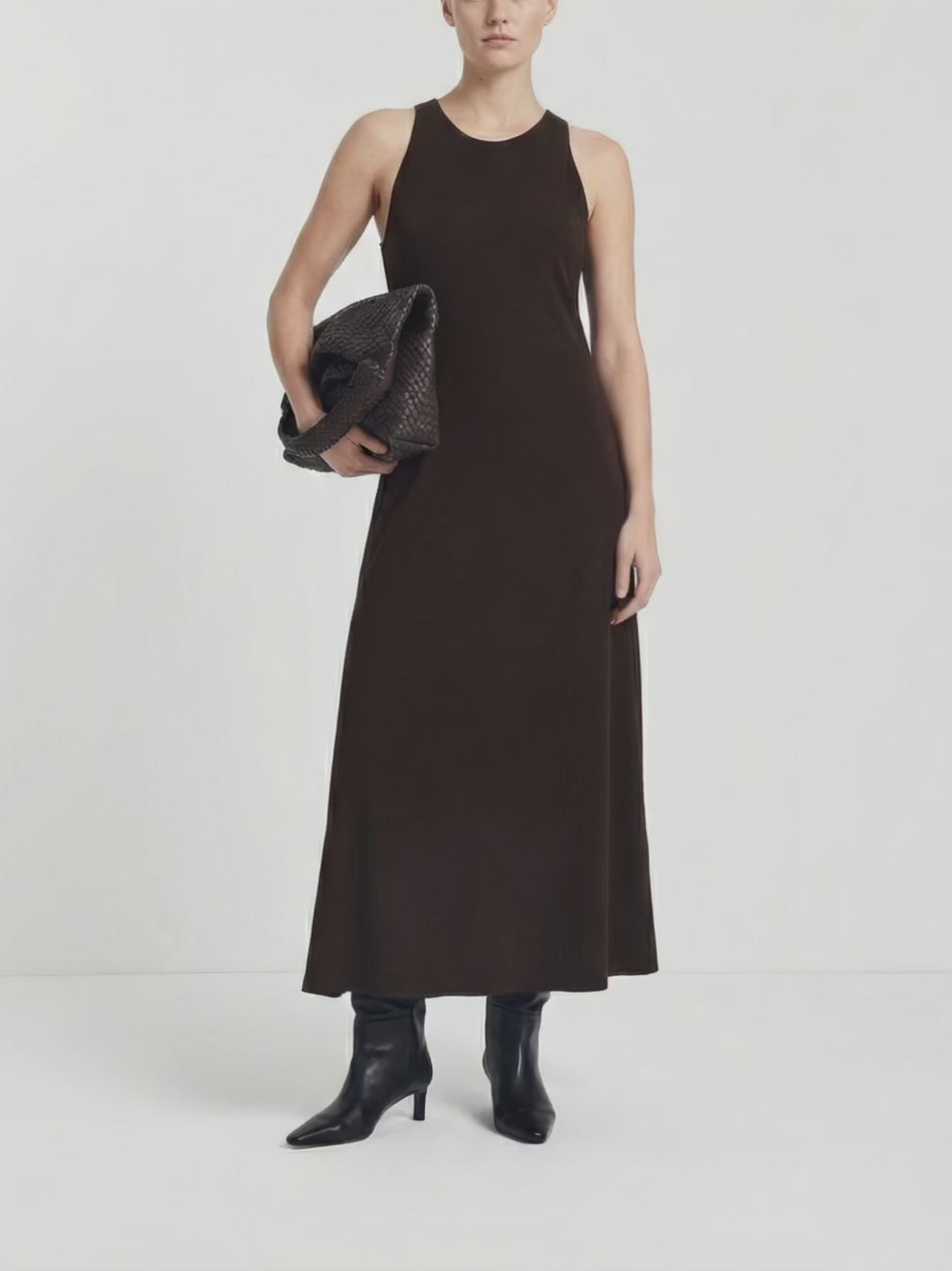 A minimal dress with a sophisticated twist. Crafted from a blend of premium organic cotton and breathable MicroModal, the full-length sleeveless dress is cut for a comfortable fit and features a crew neck and a gathered cut-out at the back. Wear it from day to night; whatever the occasion.
