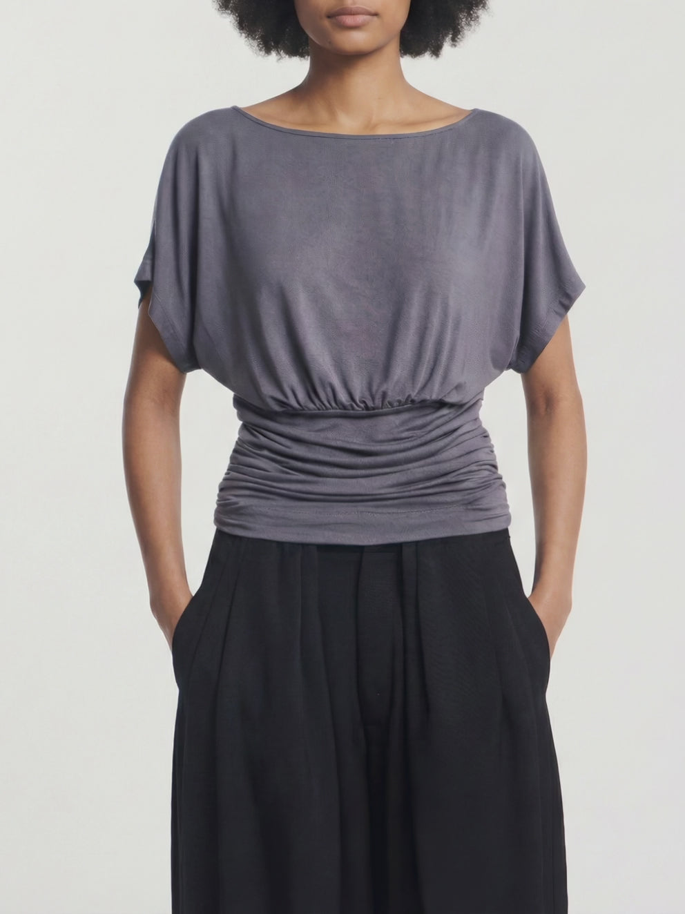A Flattering wardrobe enhancer with gathered detail and open back. The Amelie Slash Neck Gathered side Top offers a slash neckline and gathering for a sculpted, feminine shape. Crafted from stretch jersey, i... Read More