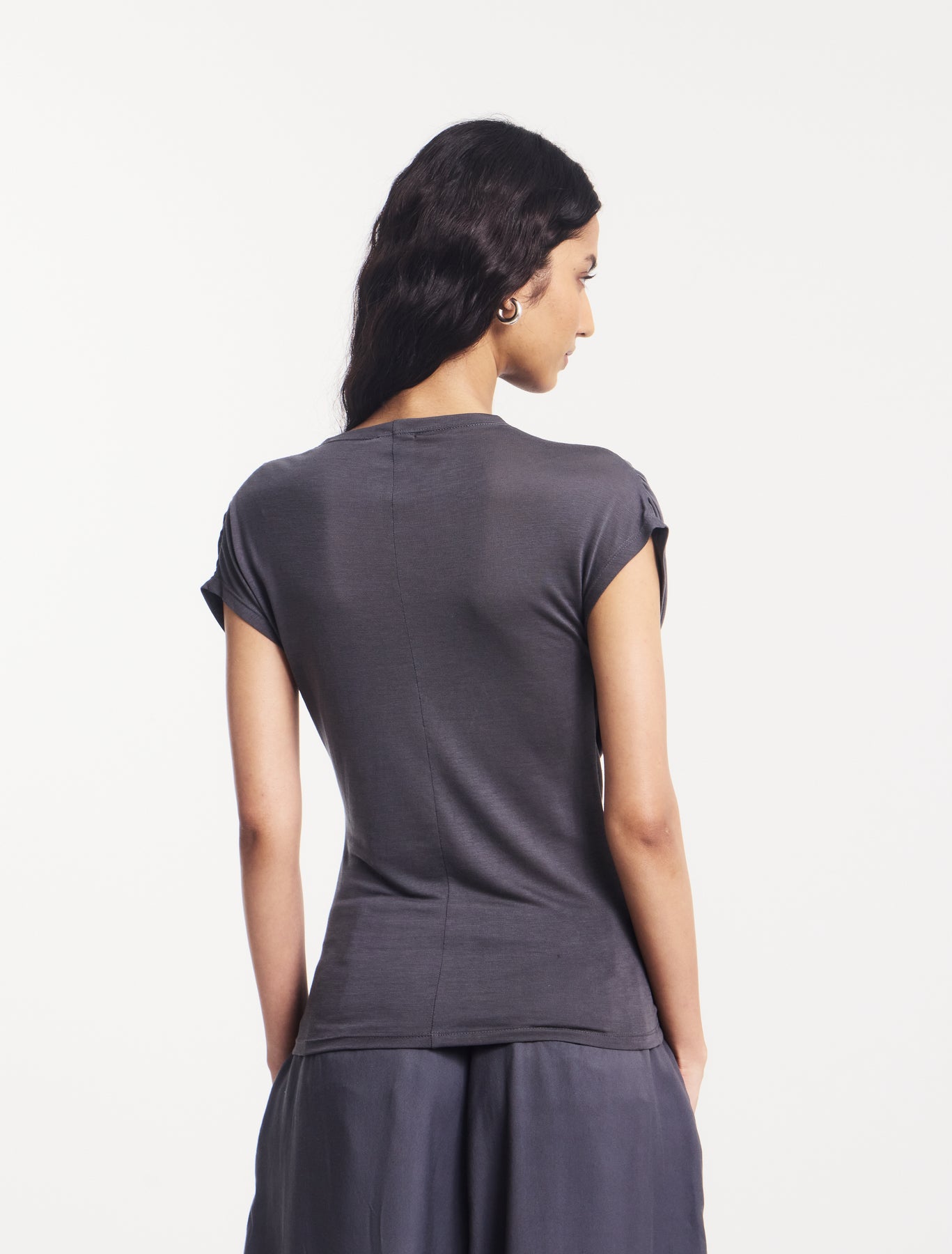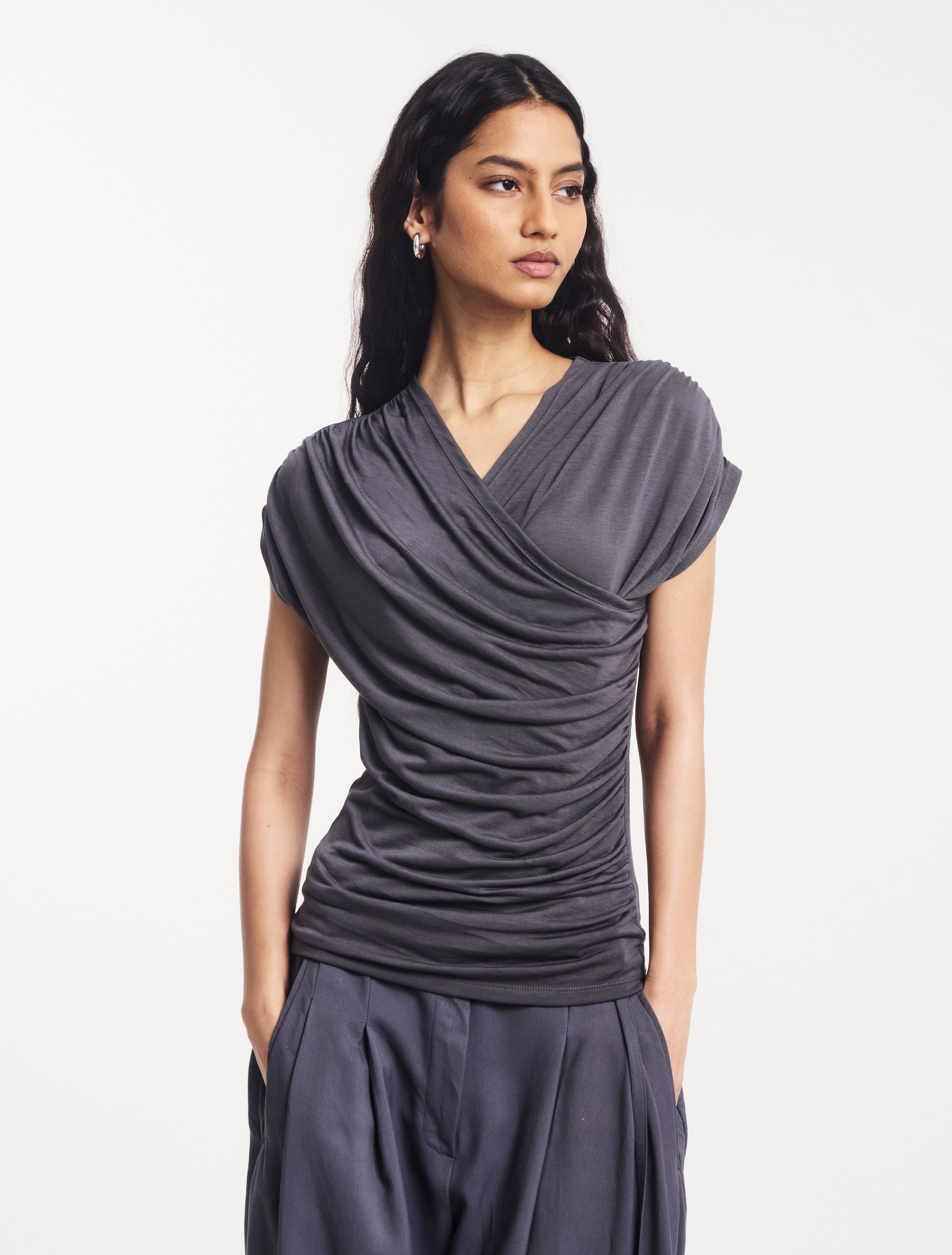 Effortless allure in a wrap design. The Indie Off Shoulder Wrap Top drapes off the shoulders with a flattering wrap front, creating a feminine, adjustable fit that's both romantic and modern. Crafted from lightweight jersey for all-day comfort, it's perfect for warm days or layered evenings. Style it with skirts or jeans for versatile sophistication. Each purchase you make helps us give back 90% of our profits to our people and causes we believe in.