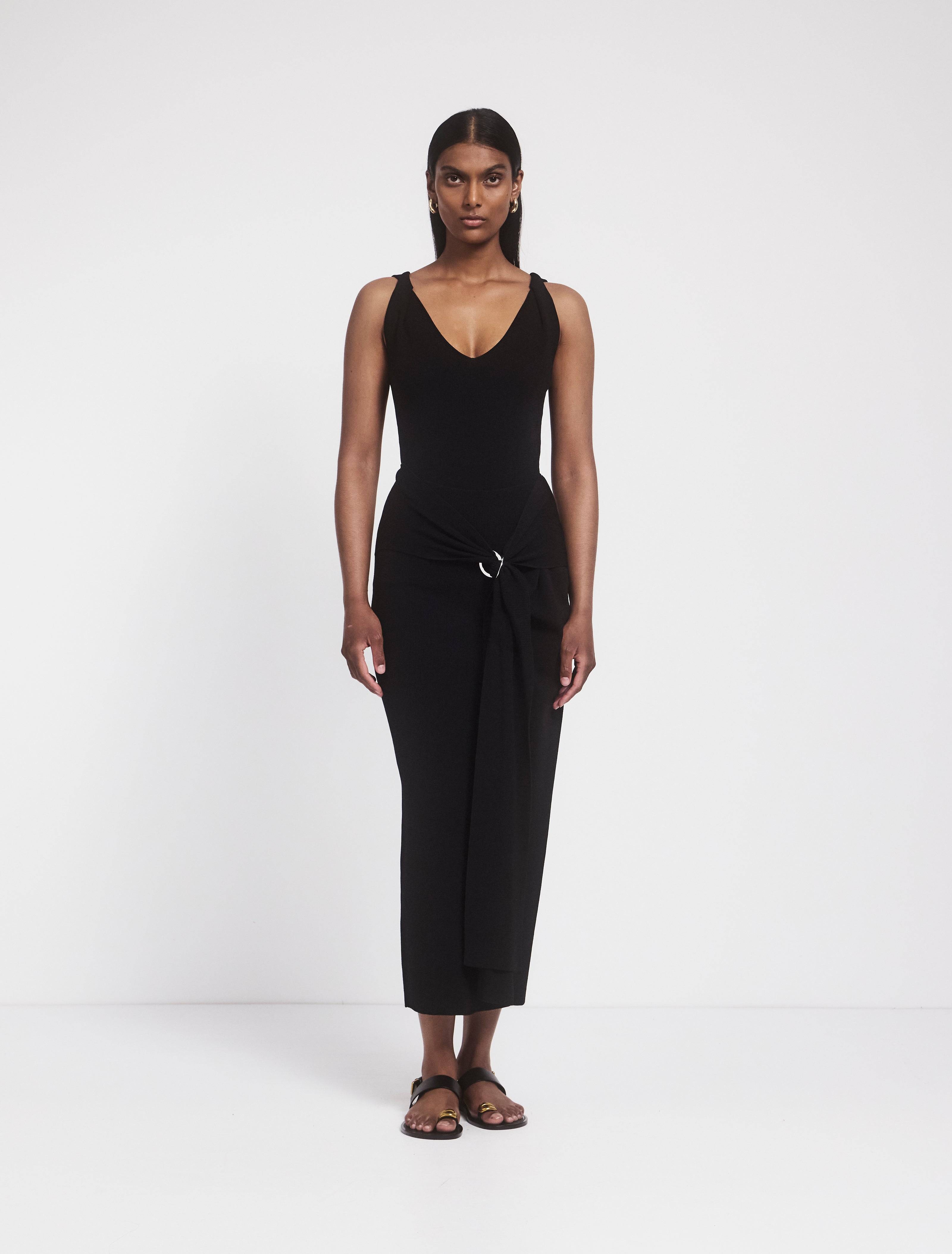 Front view of Kalmia Skirt in black knitwearBack view of Kalmia Skirt in black knitwearKalmia Skirt in black with side drape detailSide view of Kalmia Skirt in black knitwear