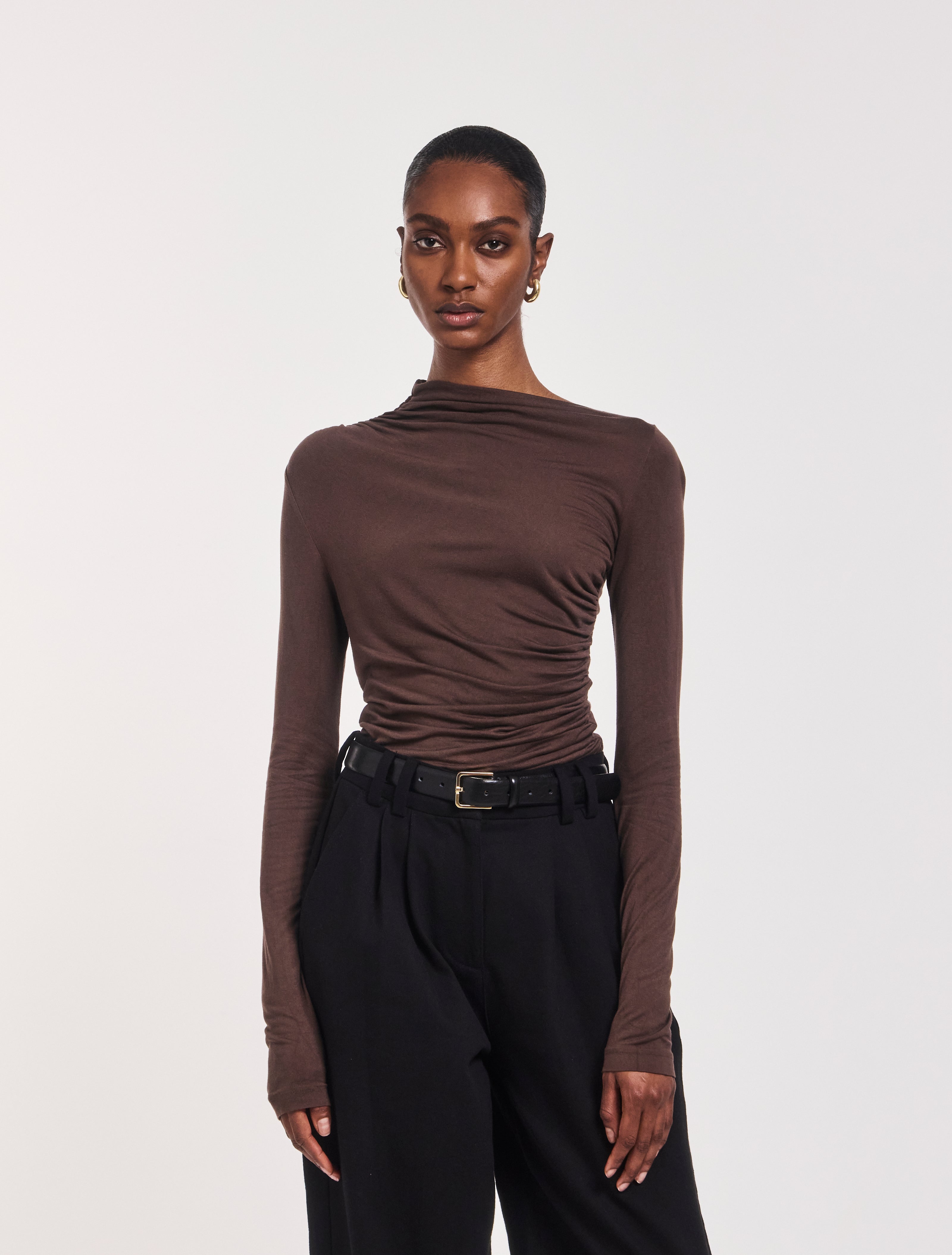 A fine, long sleeve top cut on the hips for a close fit with ruched detailing on the left side and right shoulder. Made from light and breathable MicroModal, the top is silky-soft and gently highlights the silhouette. Wear it with a pair of oversized denim or the matching skirt.