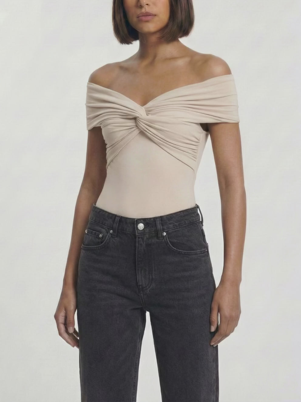 Effortlessly elegant, this off-shoulder bodysuit is crafted from luxuriously soft MicroModal jersey, offering a silky touch and second-skin comfort. Designed with a sophisticated twist-front detail, the gathered neckline flatters the décolletage while draping gently across the shoulders for an elevated, feminine silhouette. The fitted bodice creates a sleek line that tucks seamlessly into high-waisted trousers or skirts, making it a versatile foundation for both day and evening looks. Finished in a soft Enoki Mushroom beige, this piece adds subtle elevation to any look.