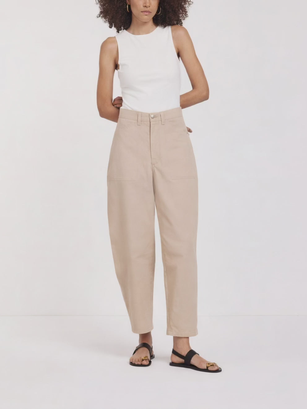 A modern silhouette reimagined with ease. These cropped barrel-leg trousers are cut from a softly structured organic cotton that holds its shape while allowing relaxed movement. Designed with angled patch pockets, darted knees, and a subtle taper, they bring a utilitarian feel to everyday dressing. A flattering high waist and clean finish make them an effortless pairing with tanks, knits, or oversized shirts.