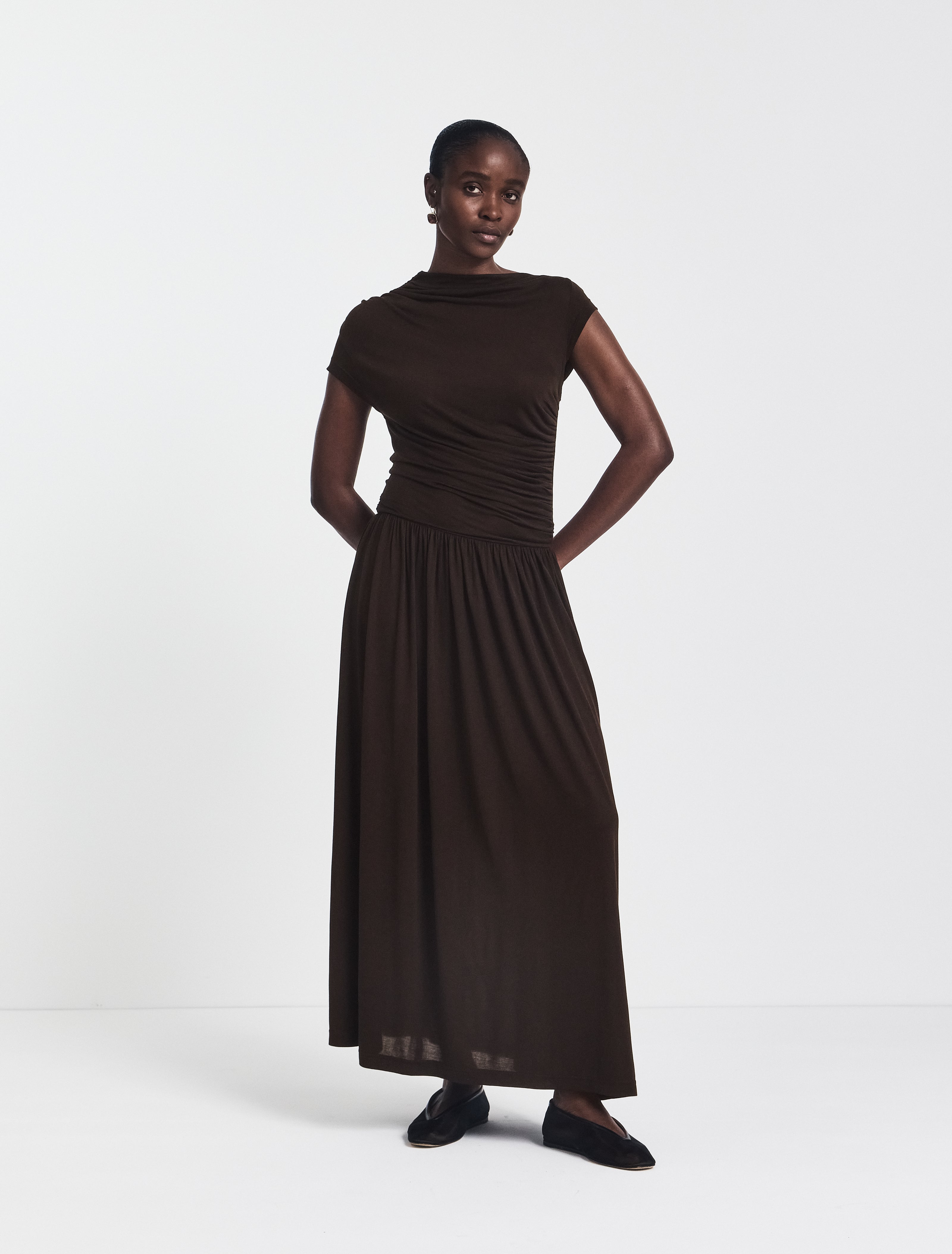 A fluid maxi dress crafted from light and breathable MicroModal with a silky-soft touch. The dress features a boat neck and ruched detailing on the shoulder, side and waist, creating a sumptuous draped effect. Wear it at night with heels to elongate the silhouette.