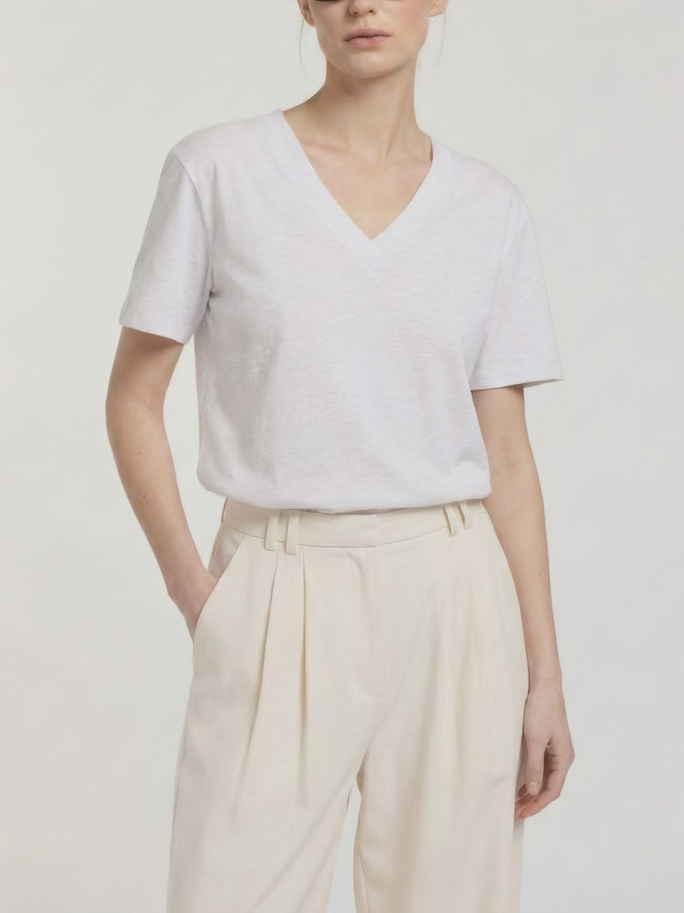 Compact Cotton V Neck T-shirt in Light Grey Marl